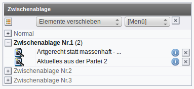 Über das Plus-Symbol kann eine der vier Schubladen in der Zwischenablage gewählt werden. Sobald eine der Mehrfach-Schubladen geöffnet ist, erscheinen hinter den einzelnen Datensätzen kleine Check- bzw. Auswahlboxen.
