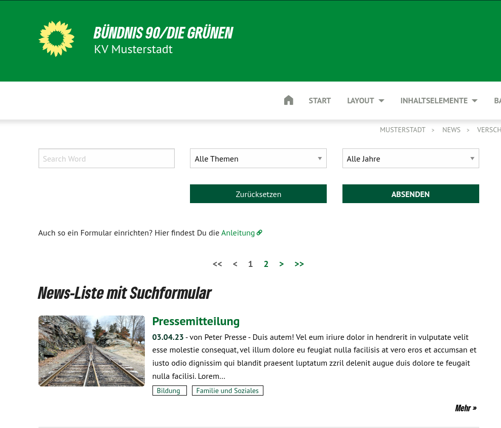 Das Suchformular kann auf einer anderen Seite etwa in einer Randspalte untergebracht werden – sozusagen als Feature "Schnell-Finder". Die von hier gesendeten Daten werden automatisch an ein Such-Formular auf der Zielseite übergeben, sofern dort ein Such-Formular identisch eingerichtet ist.