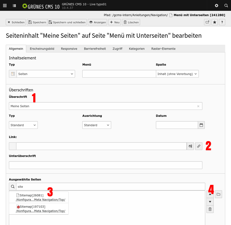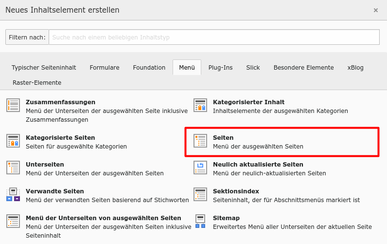 1. Inhaltselement "Menü Seiten" hinzufügen