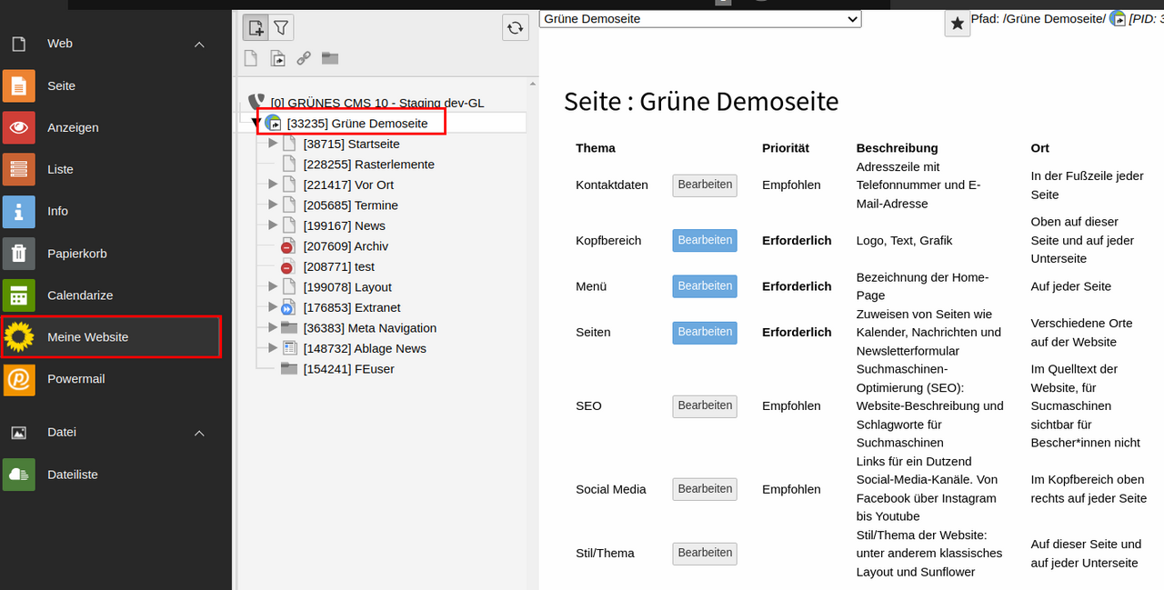Nach dem Aufrufen des Moduls "Meine Webseite" wird im Hauptinhaltsbereich die Einstellungsmaske zum Menü aufgerufen.